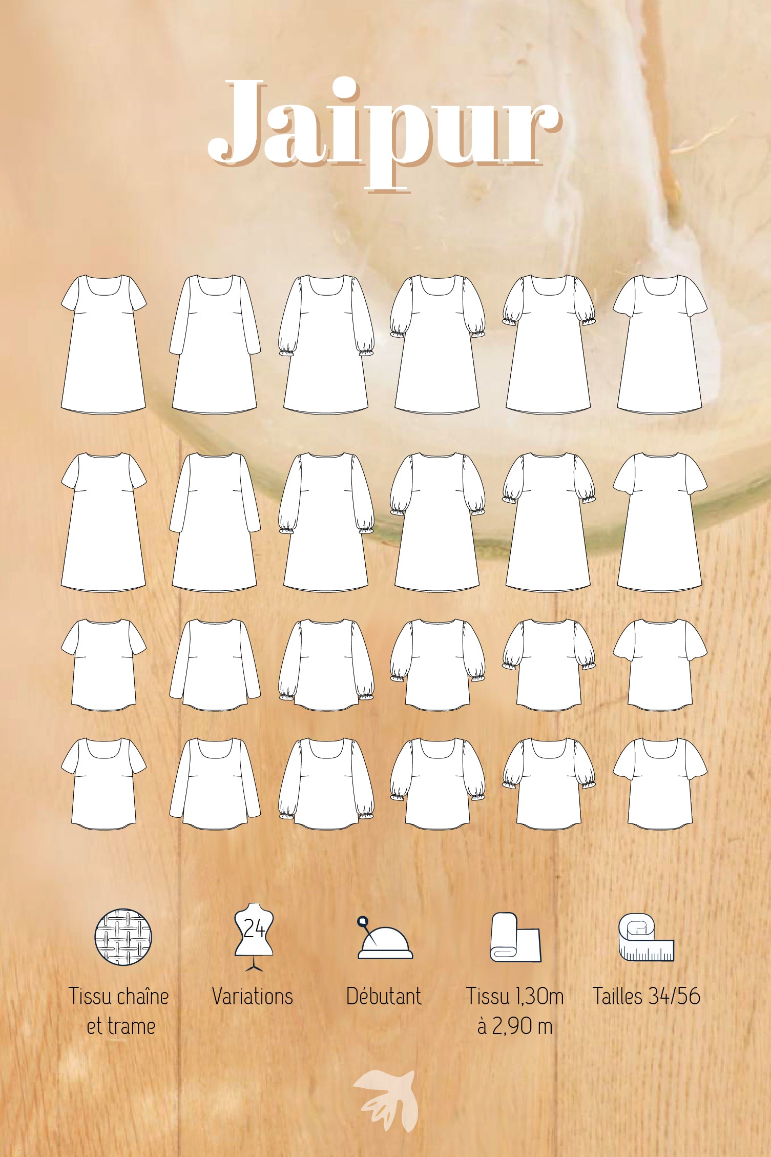 Cela représente 24 versions possibles, pour un seul patron, à coudre et recoudre sans jamais s’en lasser. Pensé pour les débutants motivés, Jaipur permet de progresser en douceur avec quelques fronces et la pose d’un biais invisible, tout en offrant une cou- ture gratifiante et rapide.