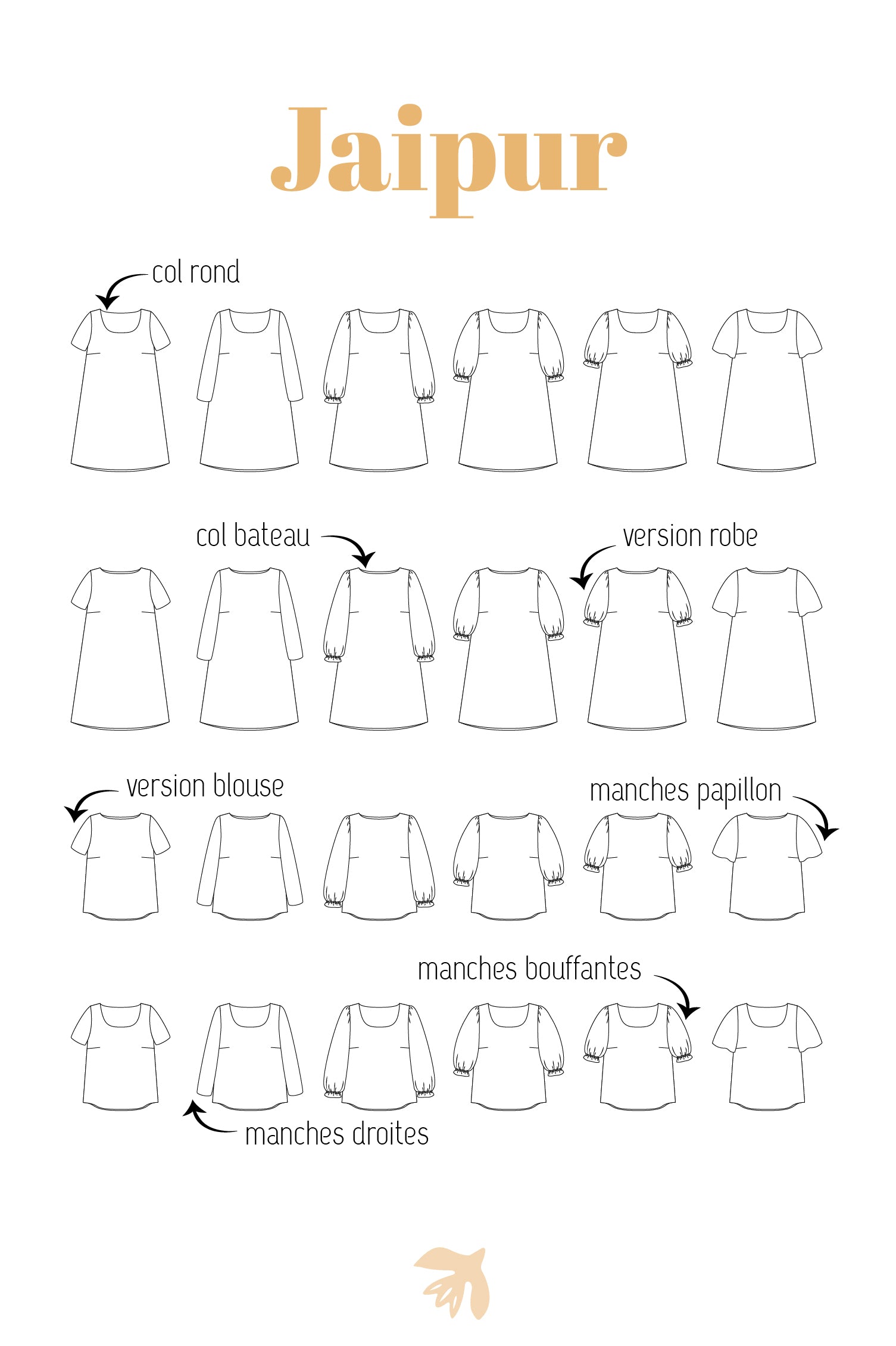 Avec sa coupe ample et fluide, ses pinces poitrine soigneusement étudiées et ses lignes élégantes, Jaipur sublime toutes les silhouettes sans contrainte. Le patron propose 2 options de col, bateau ou rond échancré, et une richesse de manches qui en font une pièce unique à chaque version : manches droites longues ou courtes, manches bouffantes (longues, 3/4 ou courtes), ou encore manches papillon pour une allure légère et estivale.