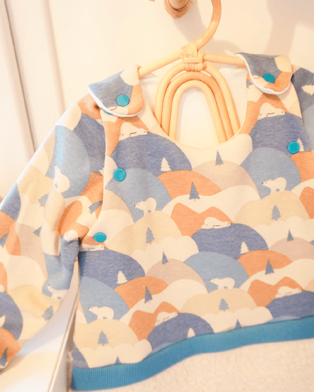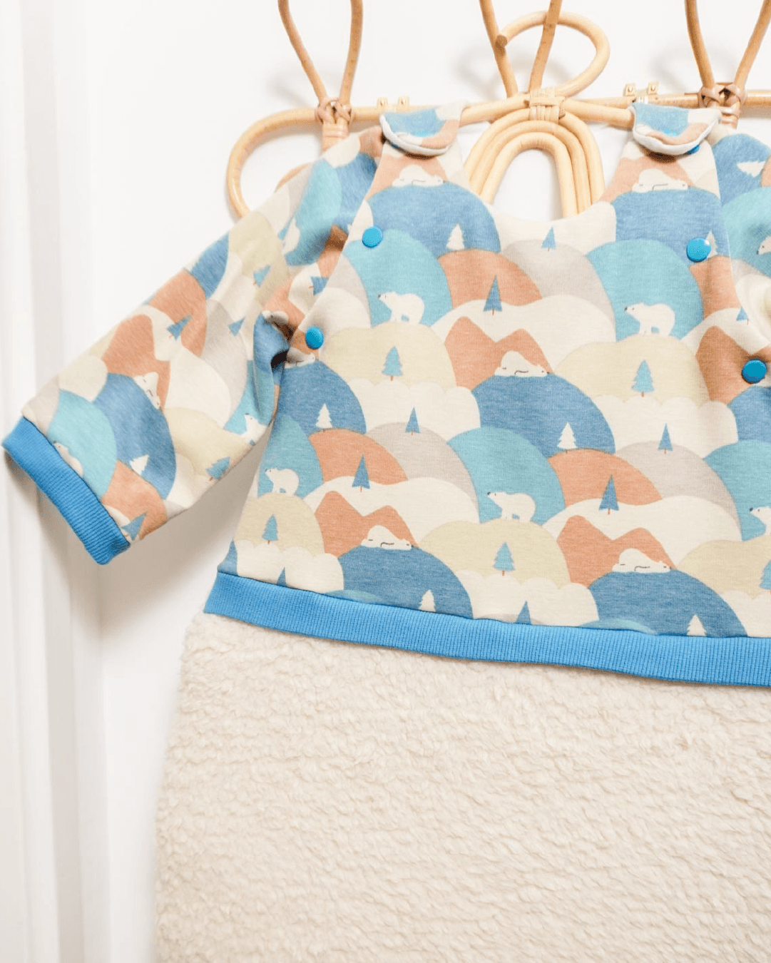 Le patron se compose de plusieurs versions : une version classique, avec ou sans poche avant pour y glisser son doudou favori ou ajouter une étiquette décorative sur le rabat de poche ; et une version à l’esprit sweat avec un haut et un bas différencié séparé par une bande rappellant le sweat.