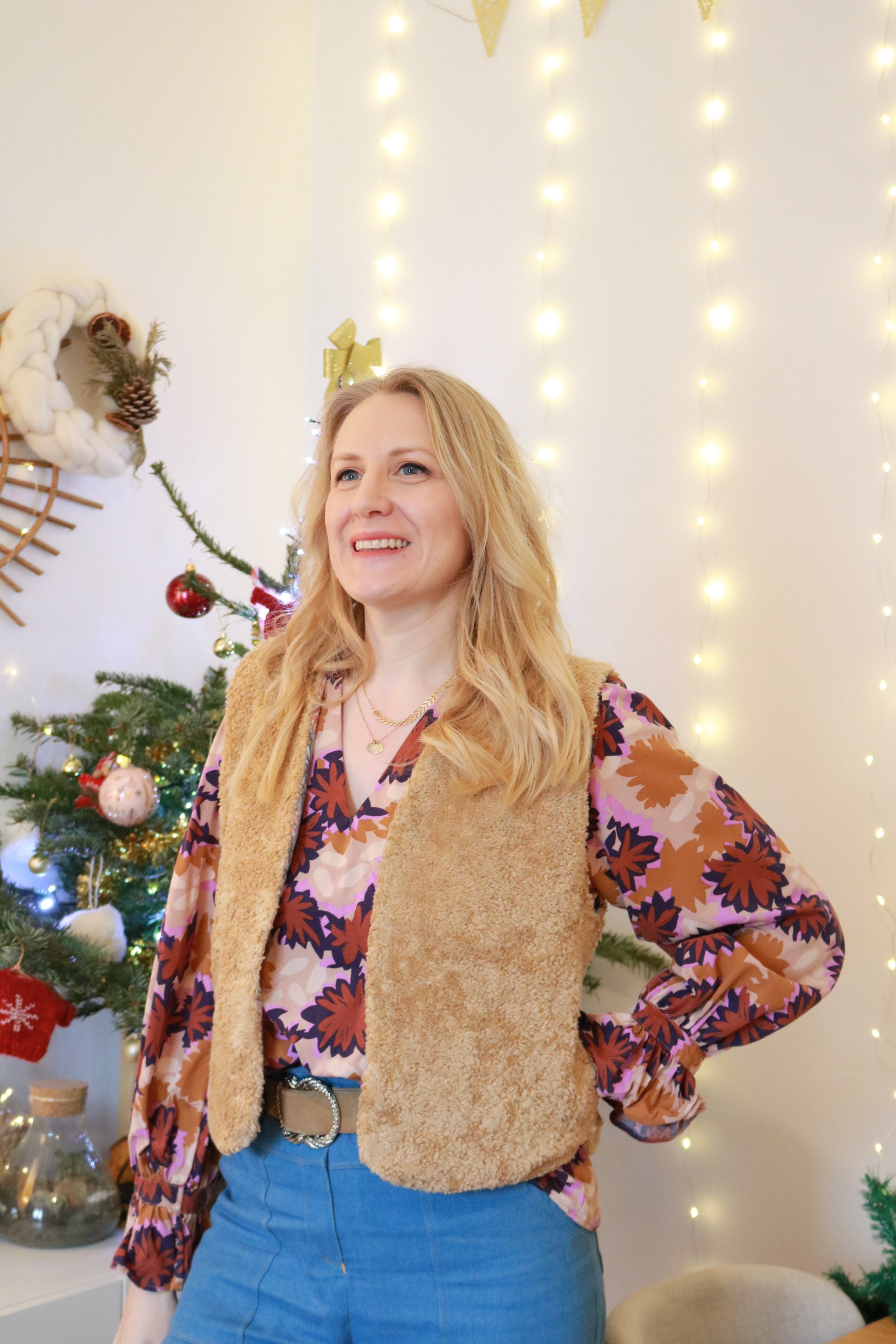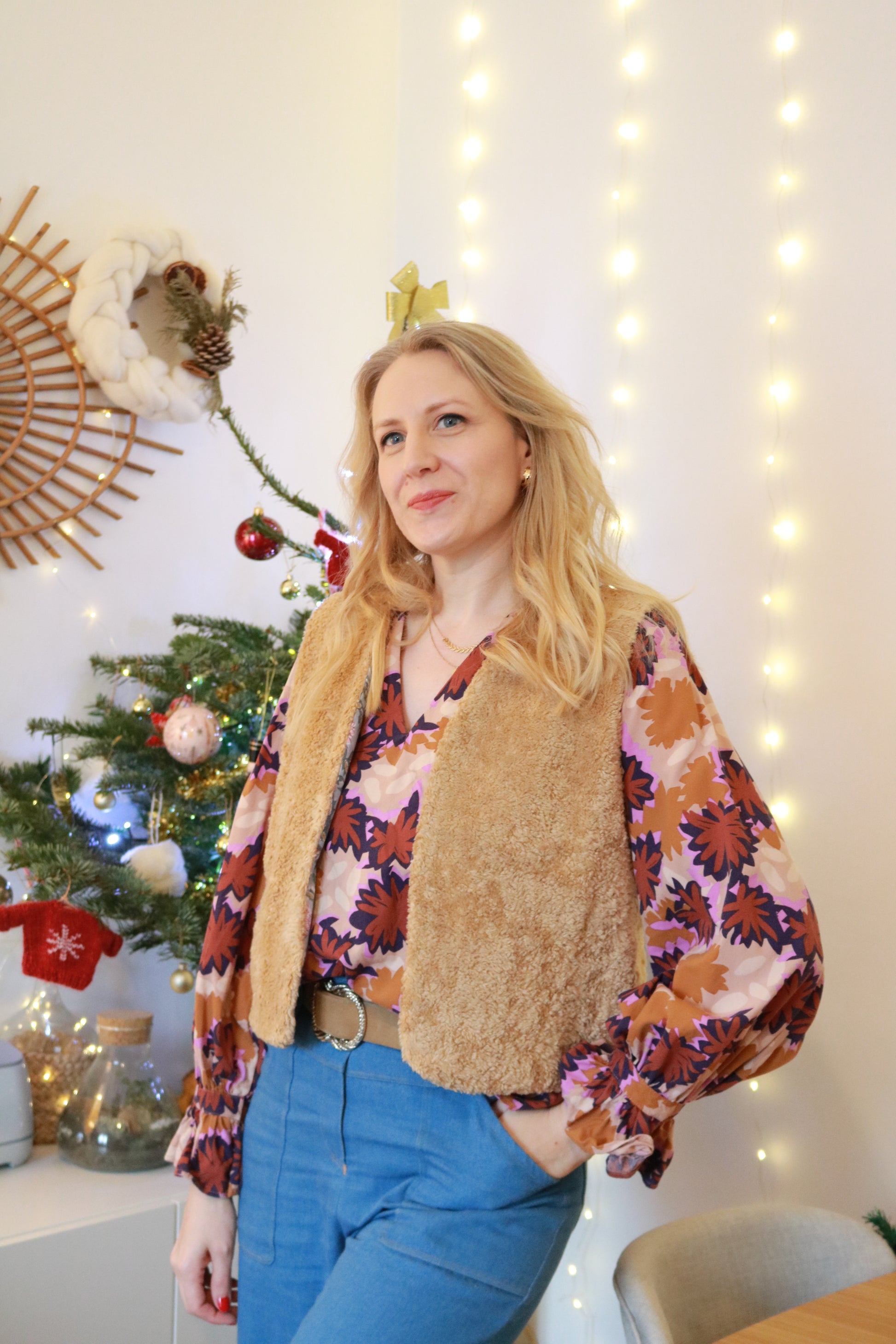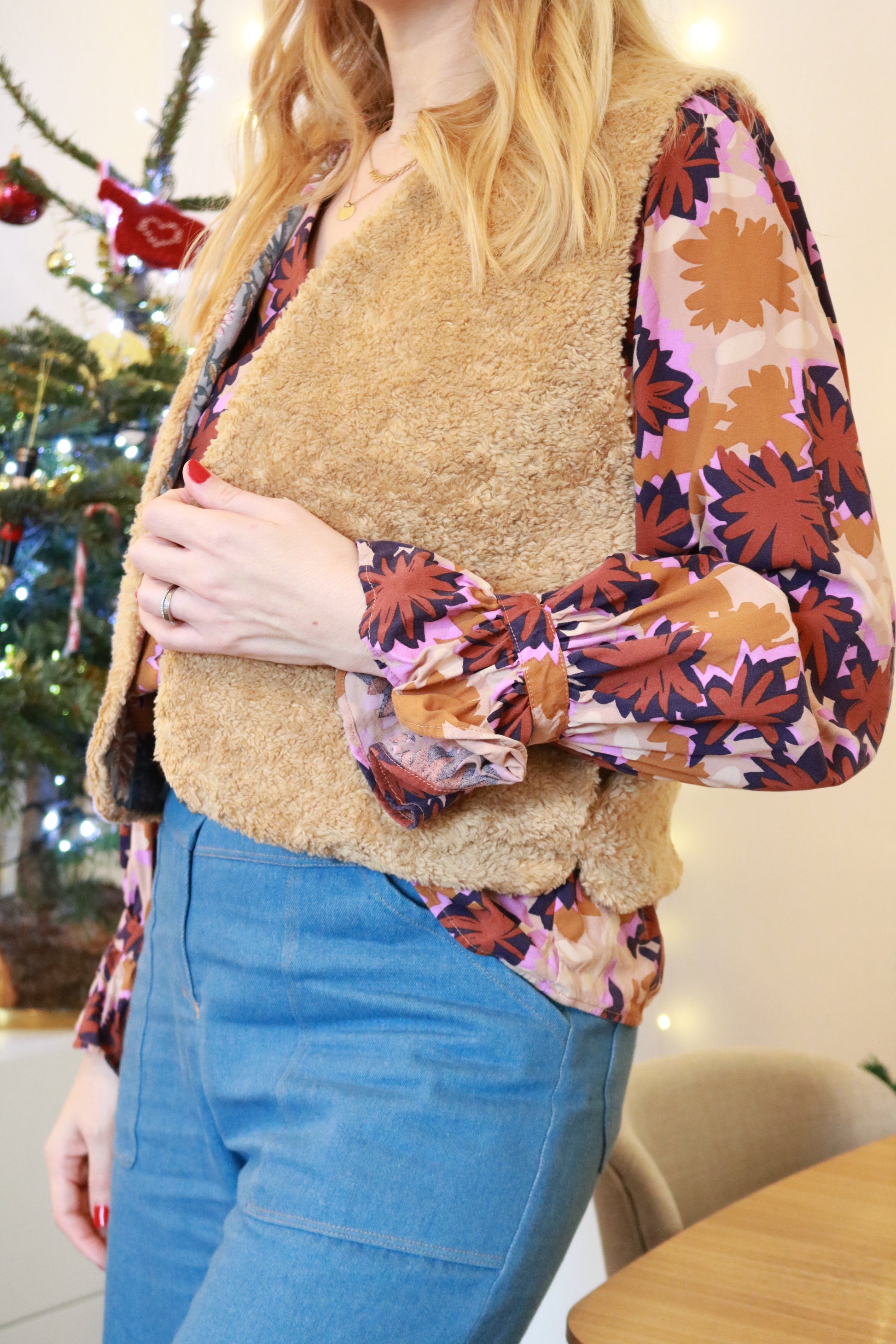 Le gilet de berger Courchevel est un bon allié pour apporter une touche de chaleur et de fantaisie à vos looks hivernaux. La coupe est près du corps et la longueur au niveau des hanches permet de créer des looks avec des pantalons taille haute ou de jolies robes. Le petit gilet entière- ment doublé avec des poches dissimulées dans les coutures côtés sera très pratique au quotidien.