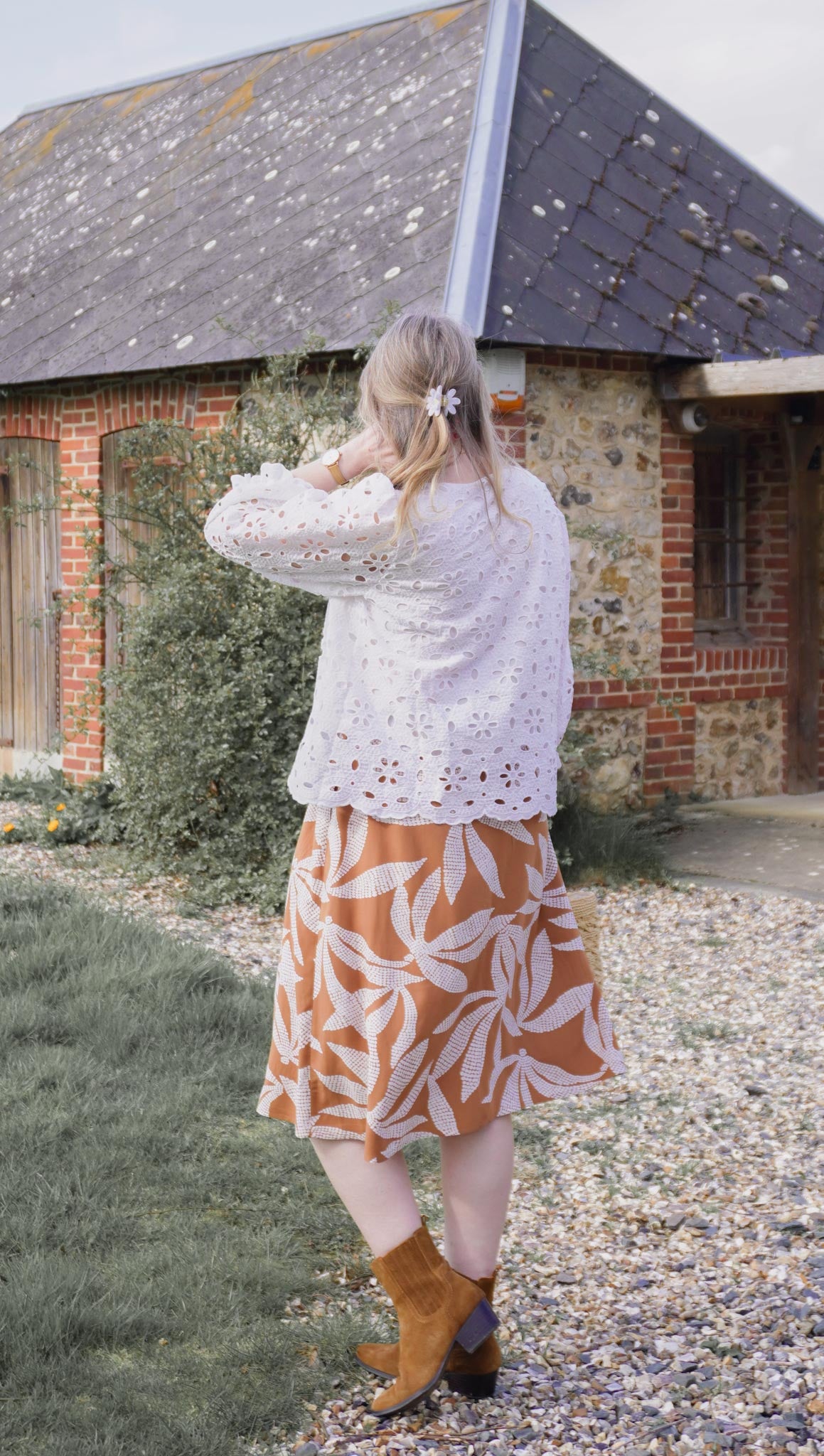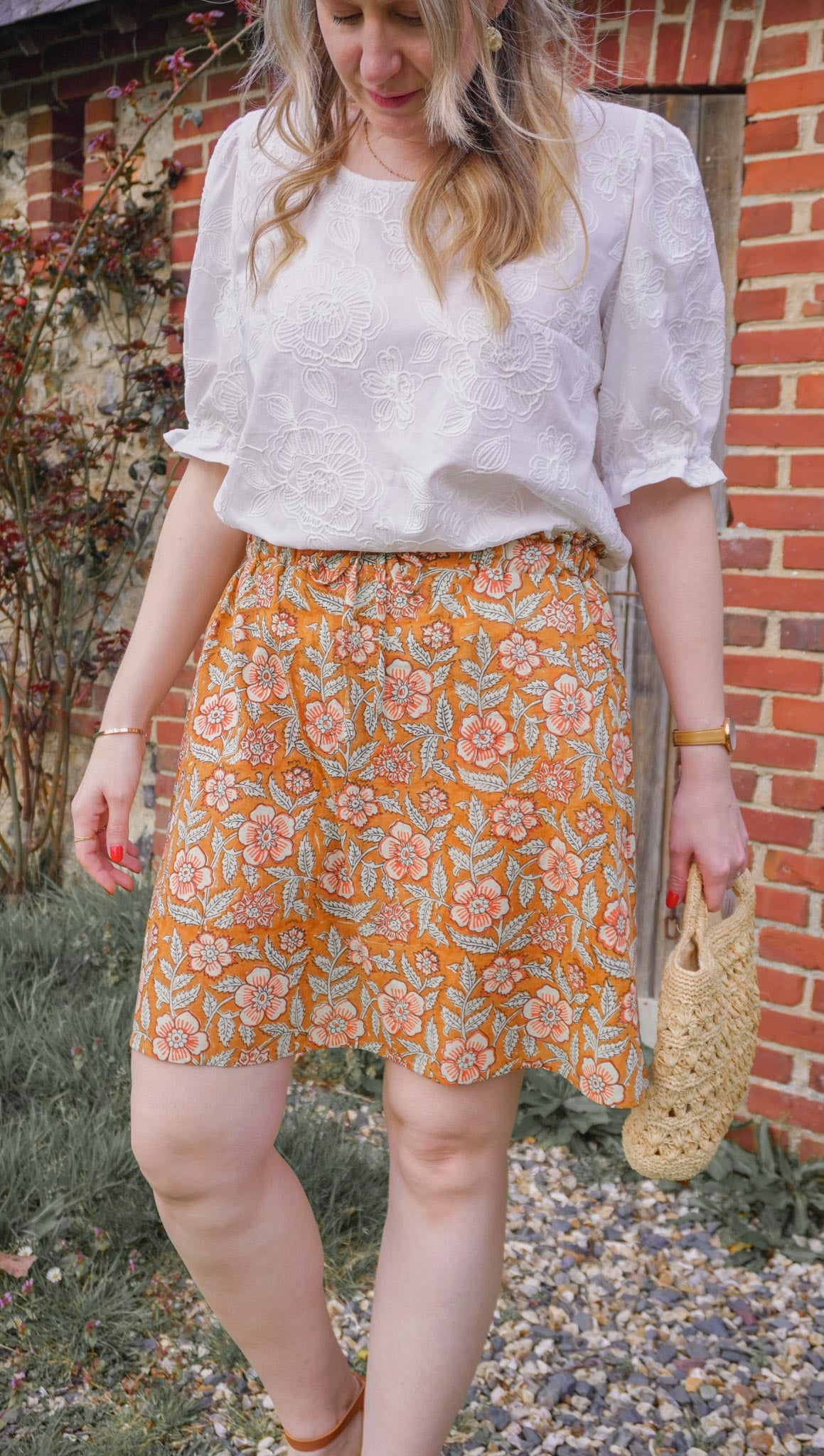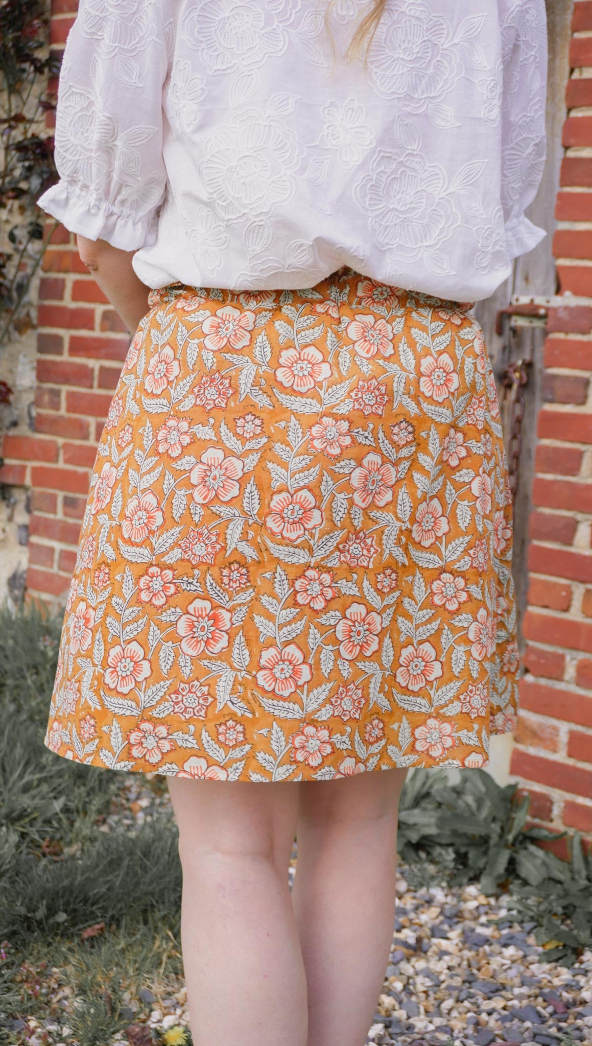 Le confort est au cœur du modèle avec une ceinture élastiquée au dos, qui permet un ajustement naturel et agréable tout au long de la journée. À l’avant, des liens à nouer viennent souligner la taille et permettent d’ajuster la jupe selon vos envies.