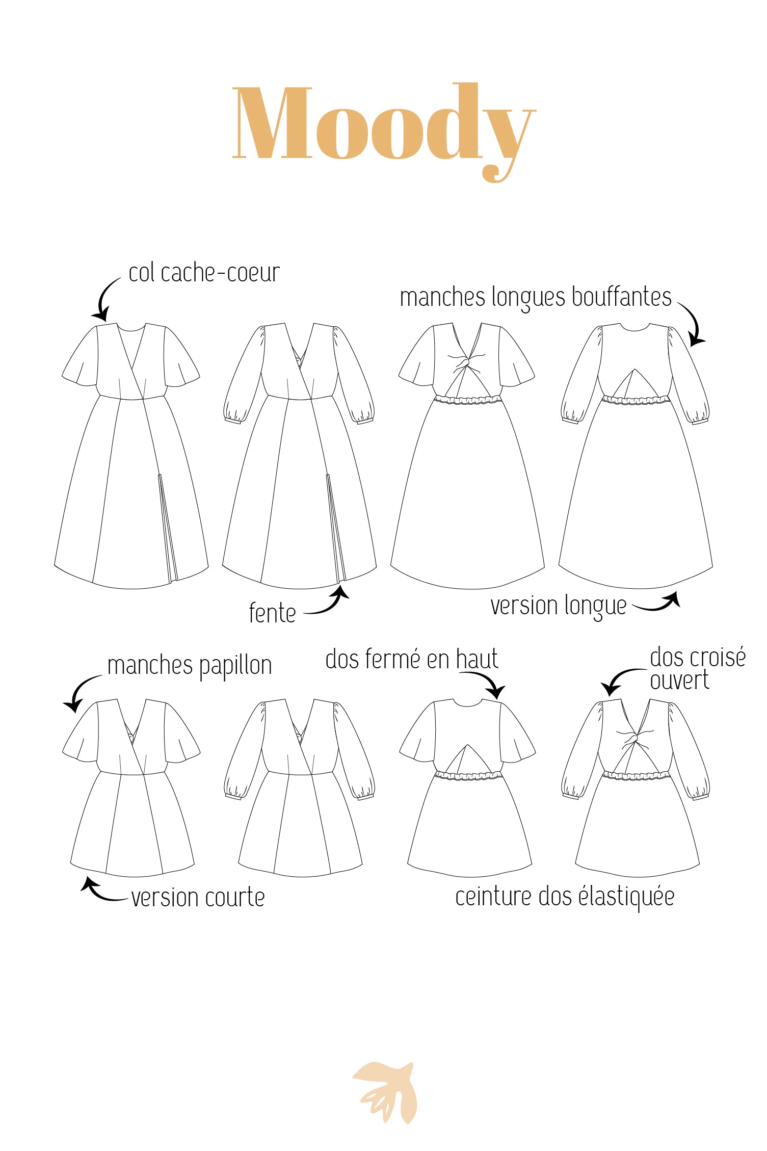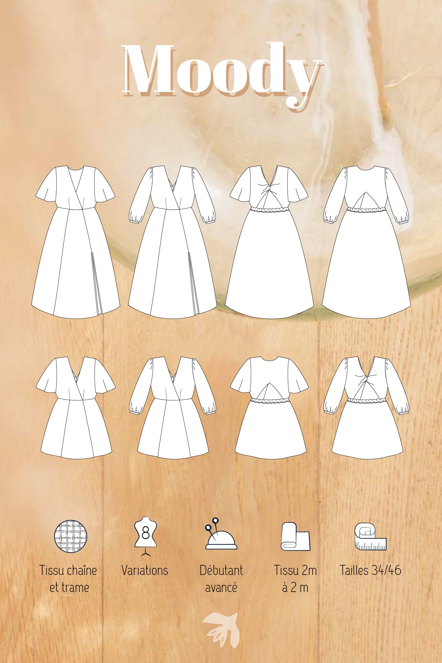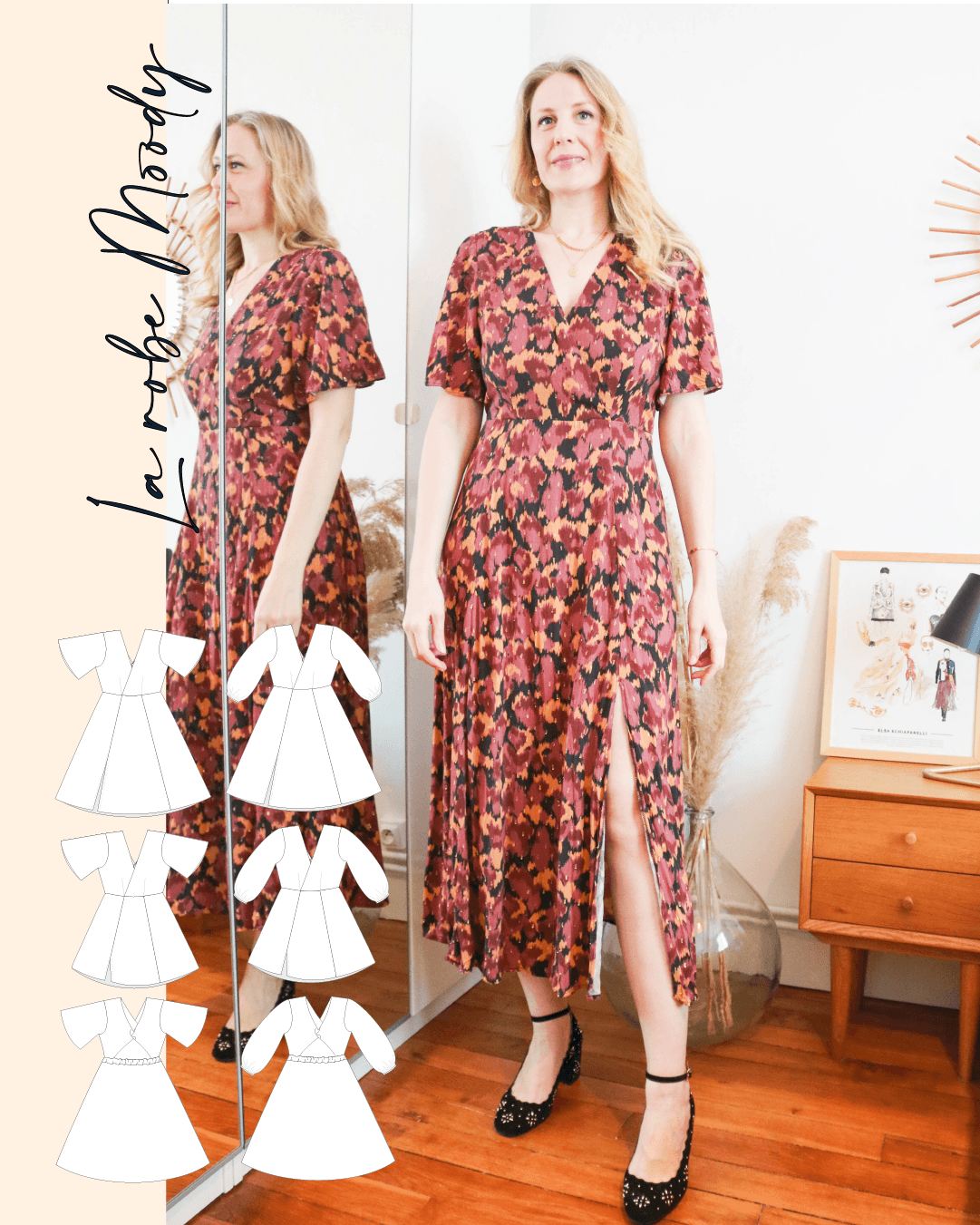 La robe Moody est parfaite pour les célébrer une belle occasion et mettre en avant un joli tissu fluide. Viscose, crêpe de viscose au fils lurex, mousseline imprimée, crêpe de polyester satiné ou brillant, tous les tissus festifs fluides conviendront à la coupe de votre robe.